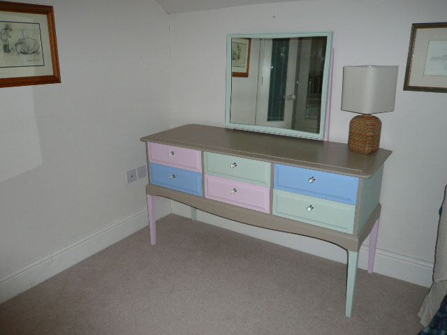 But first I had to make a sketch detailing which drawer fronts, surrounds, uprights, mirror frame, top and legs were to be painted in which colour. You can only imagine the possible combinations – but no problem, owing to my new found clarity of vision I was able to decide pretty much straight away – no changes of mind. Three days later, all done with three coats of paint (also bought online) and I’m very happy with the outcome.